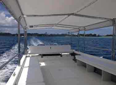 8) Passenger seat set in port side, star board and stern. 2 sides seat is fixed, made by fiberglass, supported by 7 pieces of fiberglass ribs, soft pad on seat screwed tightly. Stern seat can be opened up.